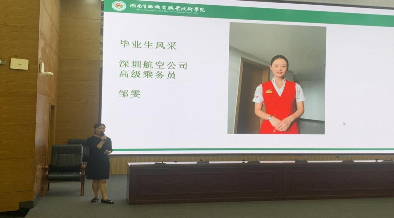 周琴重点展示了专业的硬软件实力,包括先进的动态模拟客舱、形体房、急救实训室等校内实训室,以及与多家知名航空公司和机场建立的校外顶岗实习基地,为学生们提供了"上学即上岗"的实践平台。周琴还分享了历届学生在国家级、省级专业技能大赛中取得的辉煌成绩,激发了新生的拼搏热情。