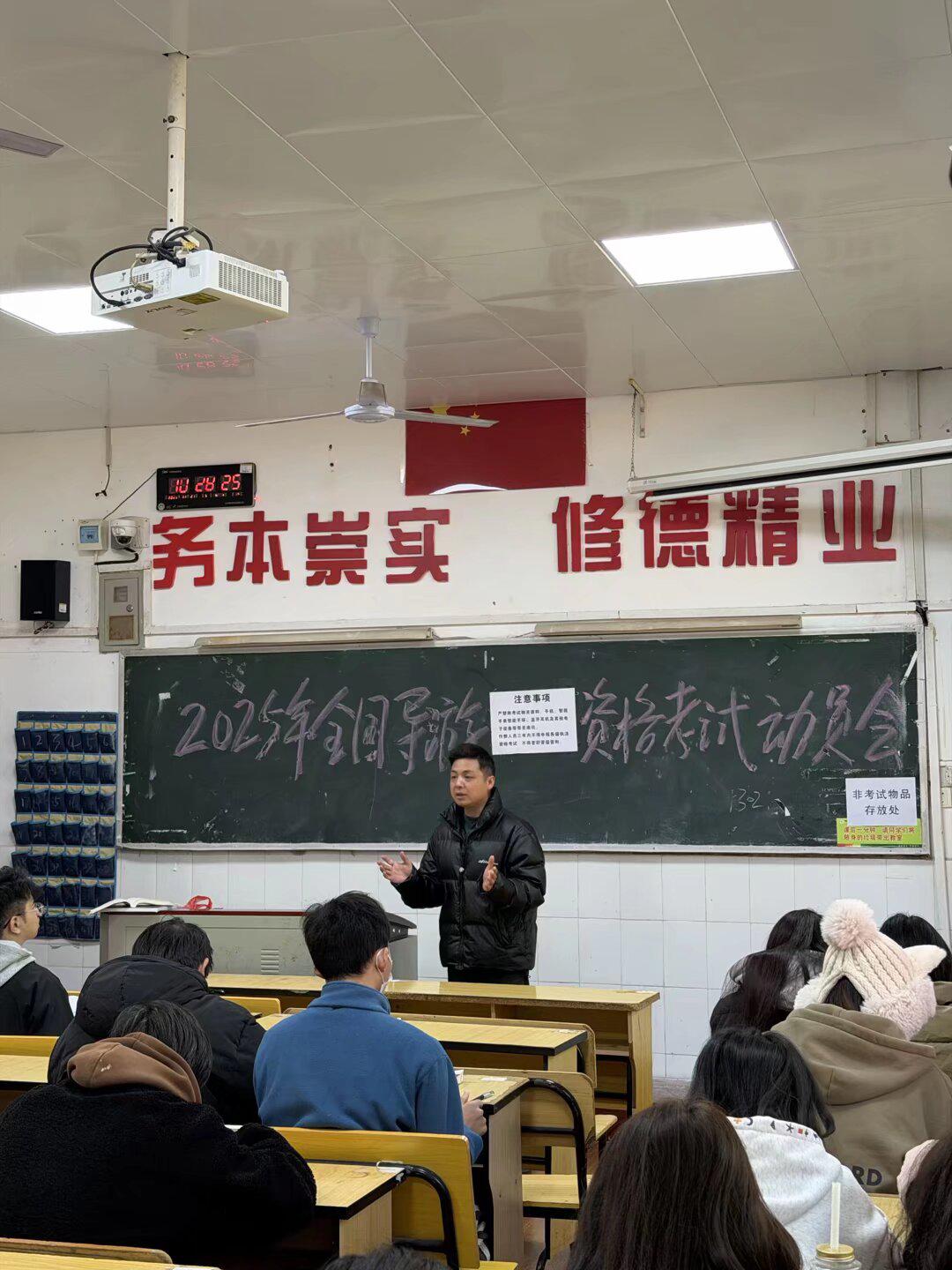 李程勇书记从党建带团建、育人育心的角度提出殷切期望。他表示,青年学子备考的过程,是践行初心使命、锤炼过硬本领的过程,学院党组织始终是同学们最坚实的后盾。他要求全体考生以党员标准严格要求自己,秉持诚信应考的底线思维,发扬艰苦奋斗的优良作风,在考场上展现人文学子的责任与担当;同时鼓励大家将备考中磨砺的毅力、积累的知识转化为服务群众、奉献社会的实际能力,未来在导游岗位上传播先进文化、弘扬时代新风,以青春之力助力文旅行业党建与业务深度融合。